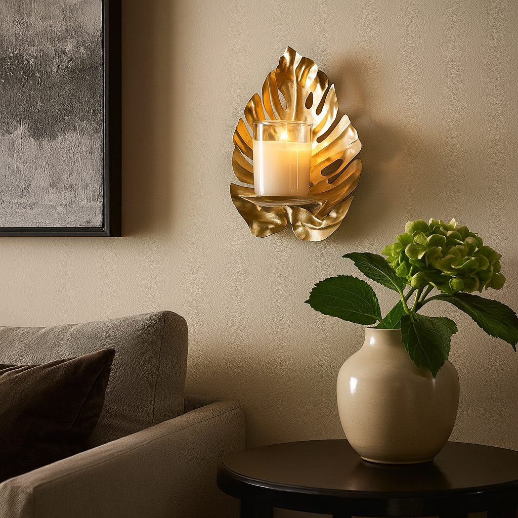 Aureum Monstera Glow™ – Gold Monstera Leaf Wall Candle Holder Sconce